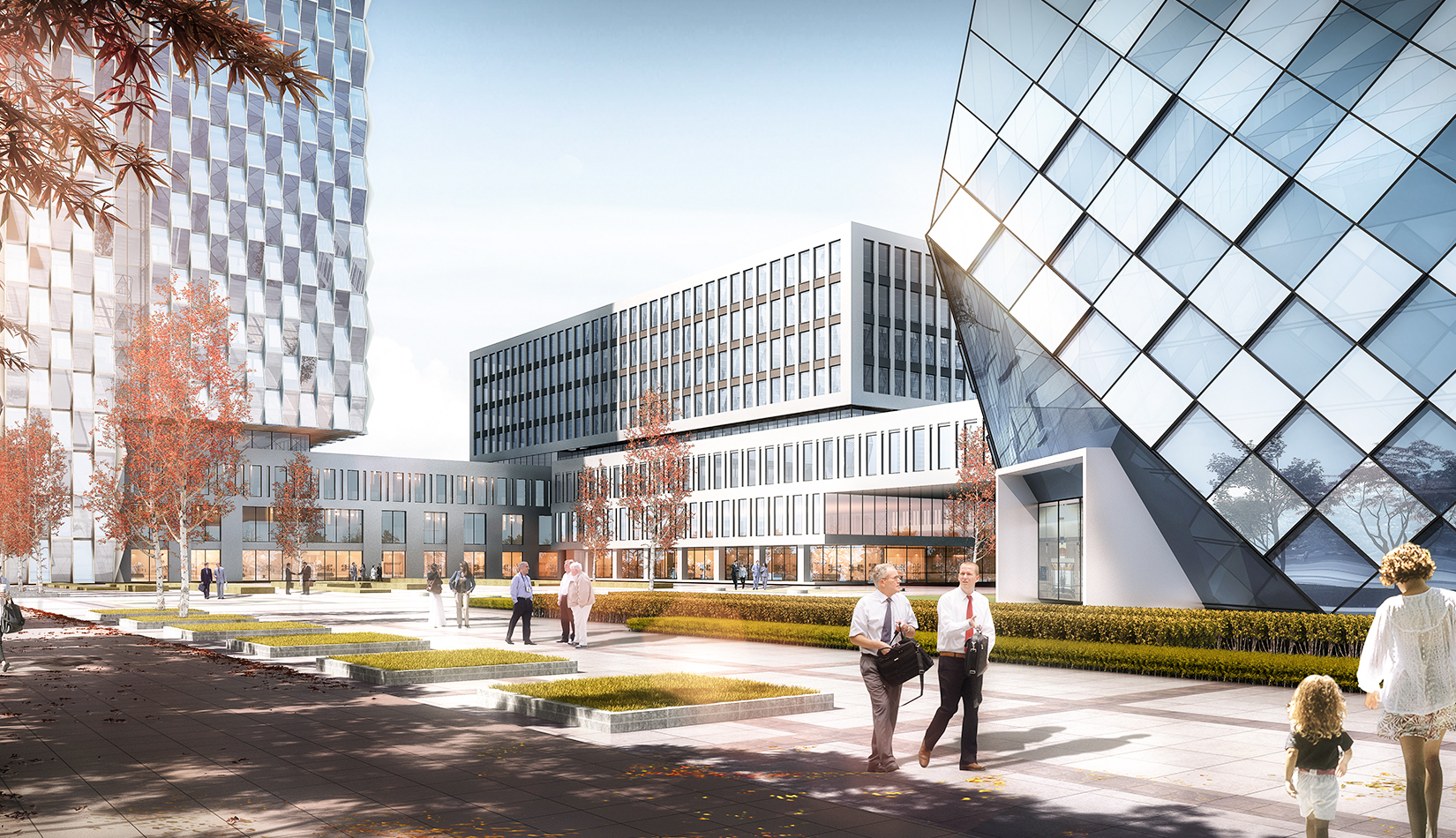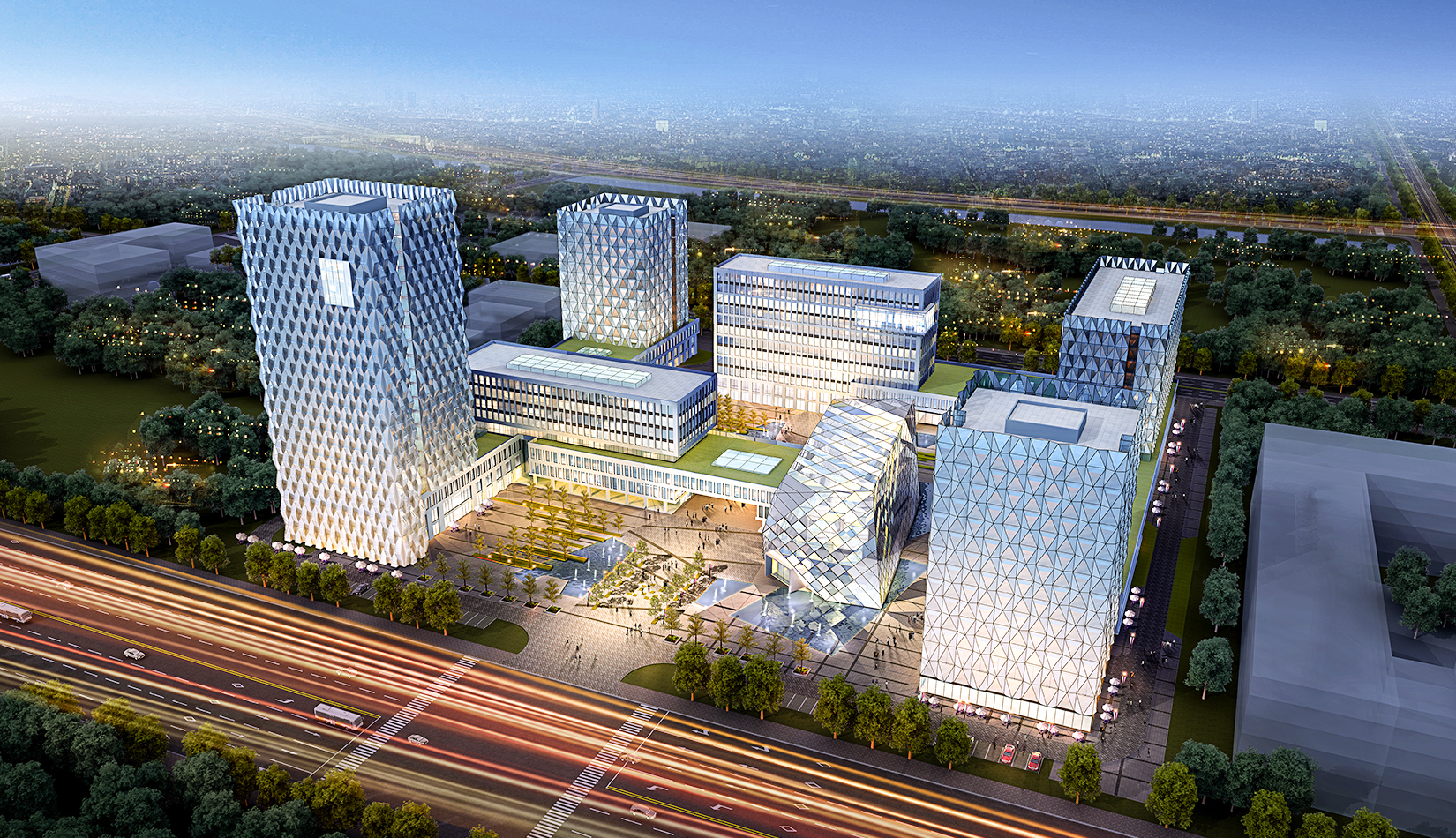 建筑立面風(fēng)格現(xiàn)代簡潔,高層塔樓以玻璃與金屬幕墻為主,塑造其硬朗簡潔的建筑性格,內(nèi)部兩棟建筑采用格構(gòu)式立面風(fēng)格,同樣以簡潔為設(shè)計原則,展現(xiàn)其富有理性秩序的立面形象。
